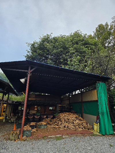 한쪽 구석에 장작용 나무들이 산처럼 쌓여있어요! 이게 엄청난 화력의 비결...!