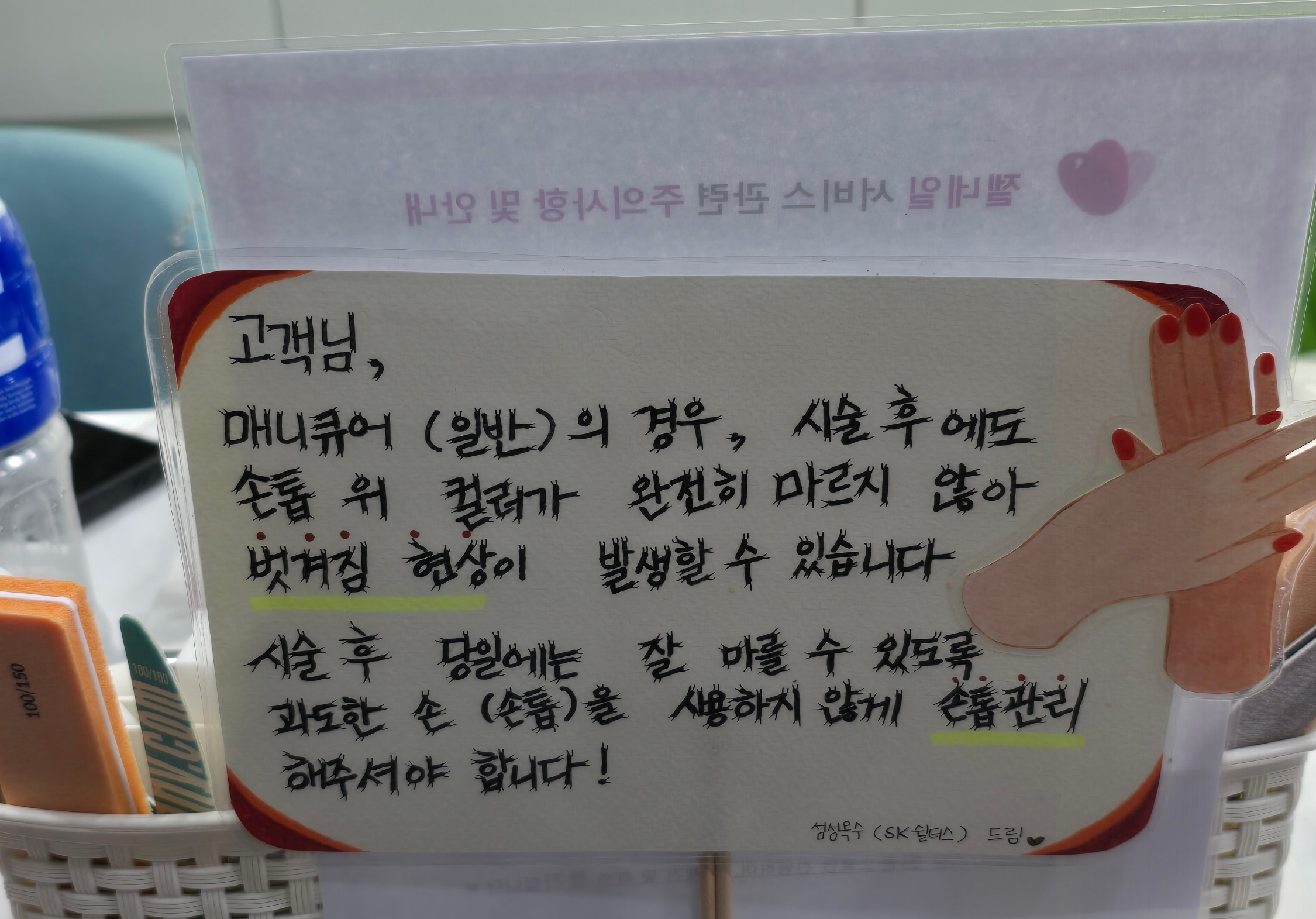 (예약을 안하고 그냥 방문해도 손님이 없을 시 네일케어를 받을 수 있지만, 기존 예약손님이 있을 시 케어 불가)